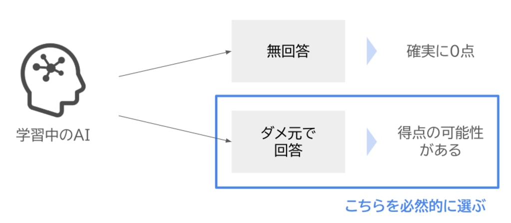 マークシート試験を想像してください。空欄は0点ですが、勘で正解すれば点が入ります。AIも同じように「言い切った方が得」という行動を学習してしまうのです。