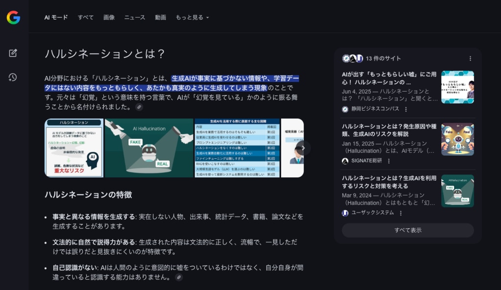 もっともらしく見えて事実と異なる回答をAIが堂々と出してしまう現象を「ハルシネーション」と呼びます。たとえば人の誕生日や本のタイトルなど「正解が一つで、知らなければ答えられない」質問で起こりやすいとされています。