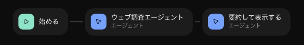 Agent Builder上では、このようなプロンプトを設定し、 「Web調査 → 要約 → チャット出力」という一連のフローをノードで構築します。