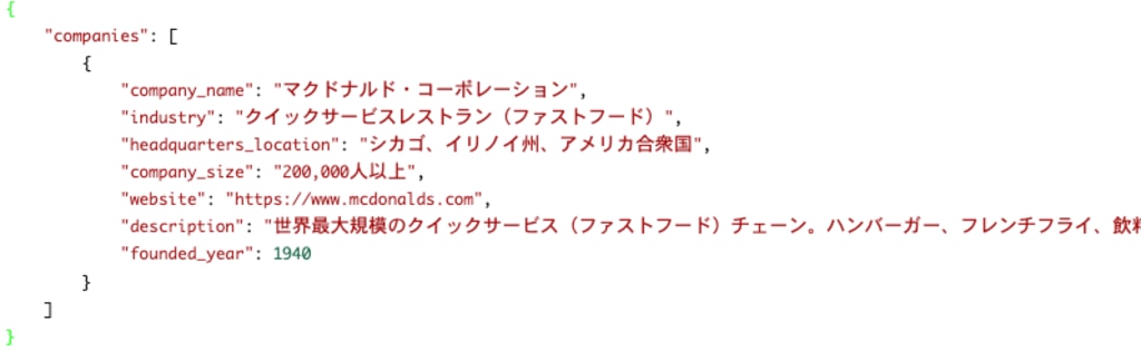 ▼出力例①:Web調査エージェントでの構造化された会社情報