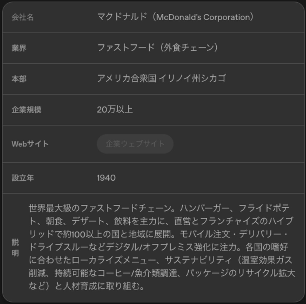 たとえば、「マクドナルド」を調査してみると、以下のような出力が生成されます👇