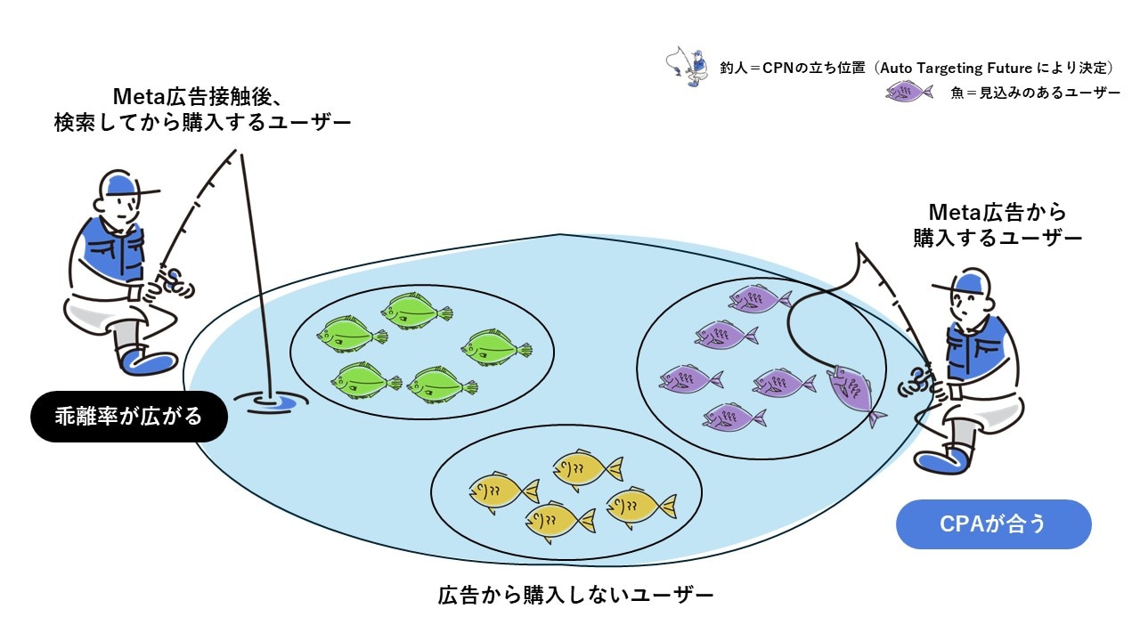 つまり、運用施策でどれだけ新規キャンペーンを立てても、Meta広告から直接購入するユーザーに出会う確立は低いままであると考えました。