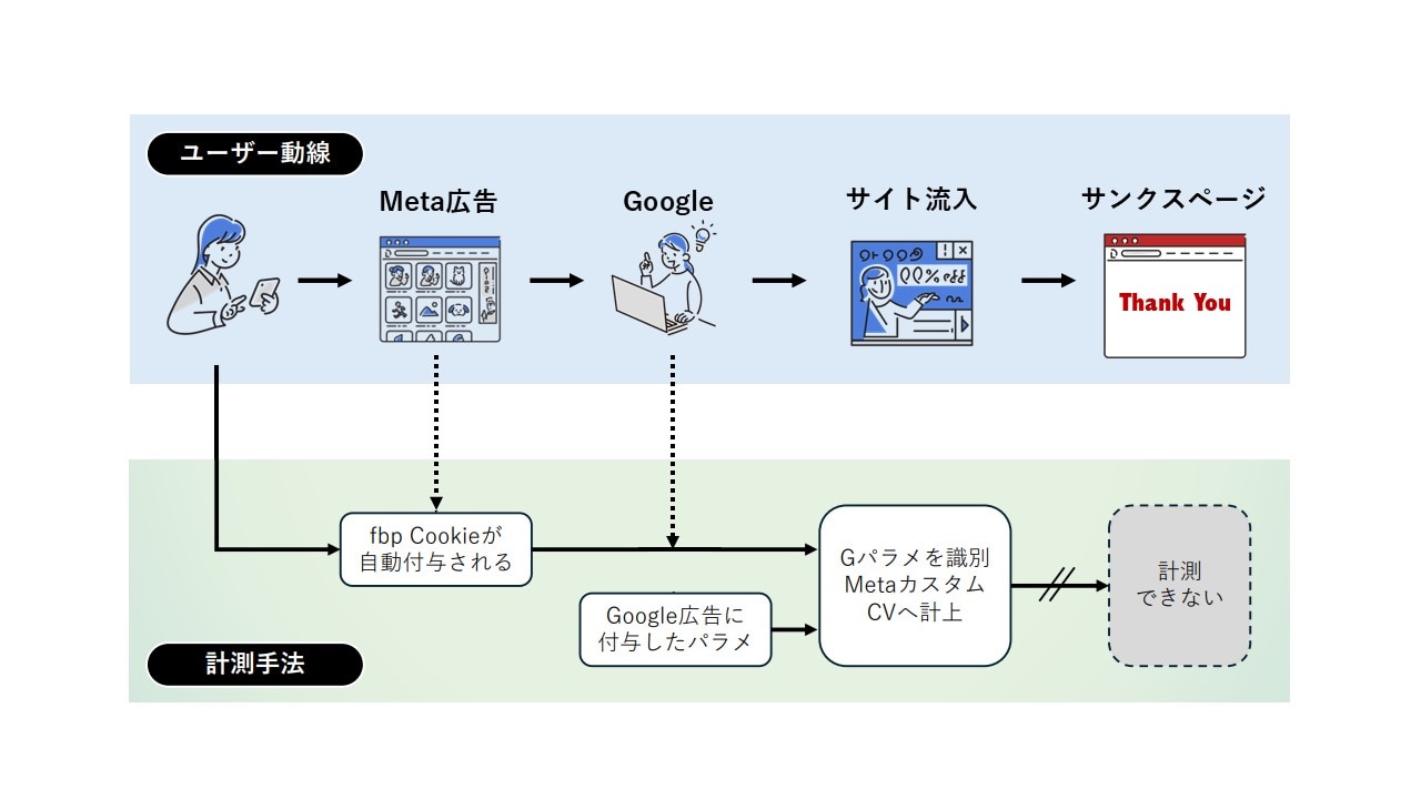 そのため、Meta広告接触ユーザーのその後の他チャネル経由ページ遷移後の行動をパラメータからは追うことができませんでした。