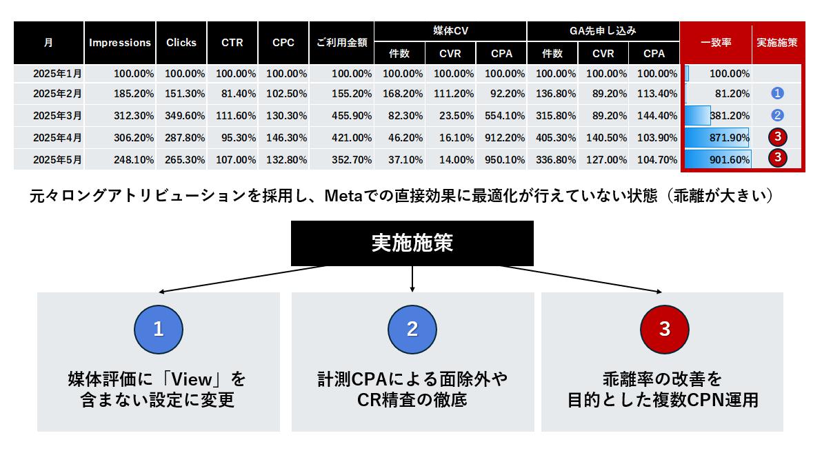 具体的には、Meta広告から直接購入するユーザーにリーチしているキャンペーンは継続し、広告接触後に検索経由で購入するユーザー(乖離率が高い)にリーチしているキャンペーンは停止する判断を行いました。この運用により、乖離率を改善し、計測CPAを大幅に改善することに成功しました。