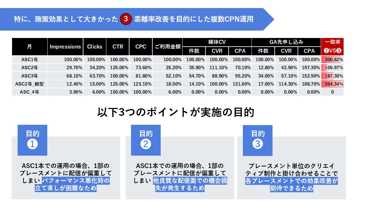 第三に、乖離率の改善を目的とした複数キャンペーン運用を実施しました。