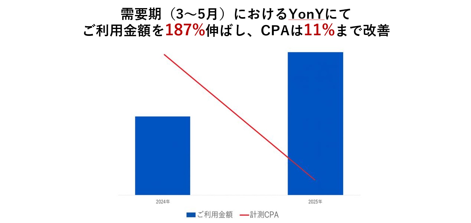 まず取り組んだのは、需要期(3月〜5月)における直接効果の改善です。2025年の需要期において、前年同期比で利用金額を187%まで伸ばし、CPAを11%まで改善することに成功しました。
