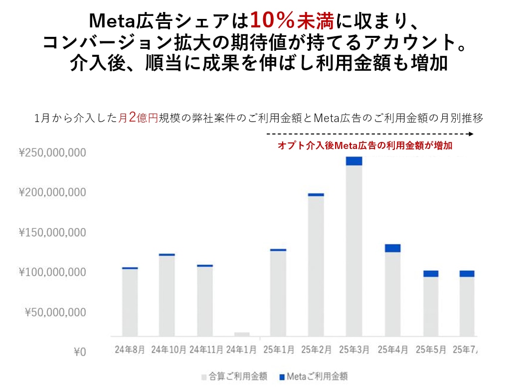 担当開始後、Meta広告の利用金額は順調に増加していましたが、全体に占めるMeta広告のシェアは10%未満にとどまっていました。